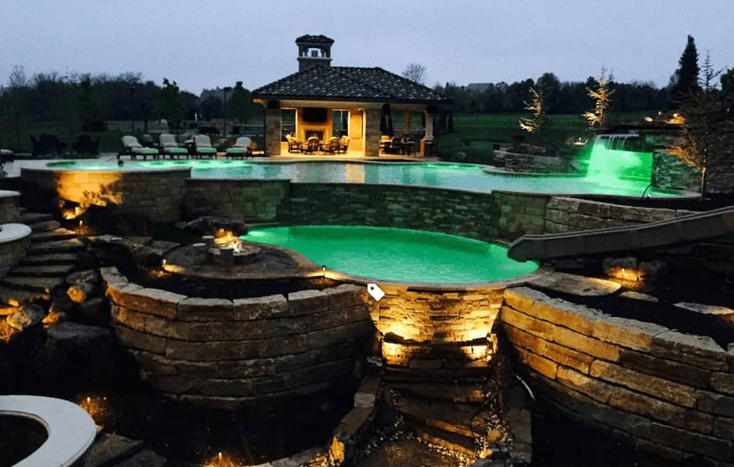 You can install lighting in the base of the pool, pole lights around it or hanging lights. I think we can all agree on how stunning this backyard looks: