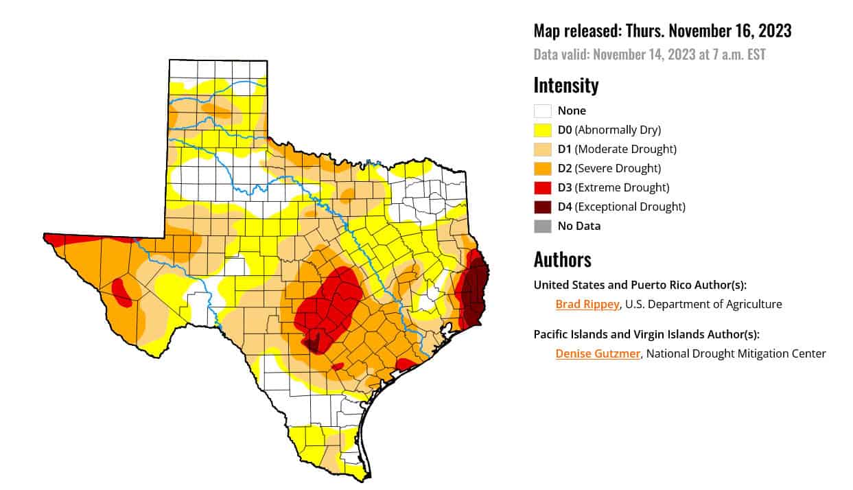 The poor water situation in much of Texas is exacerbated by widespread drought — and not just in the extreme west of the state. This map shows drought-stricken areas of Texas as of November 2023: