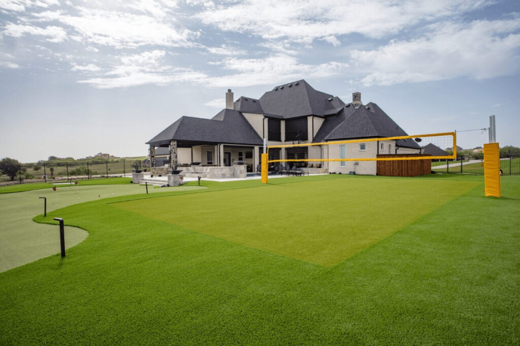 Again, encouraging active exercise for your kids is healthy and fun. Team sports can also help your children develop social skills with friends they invite around. Just make sure that you get the ground surface right. Artificial grass is ideal for most sports court purposes. This backyard in the DFW area features not only an artificial grass putting green but a volleyball court too: