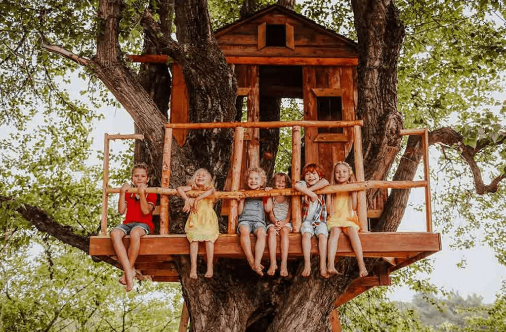 Kids love to hide out in “secret” places. If you have a large tree in your yard, a treehouse is a great small backyard playground idea that utilizes the existing features without taking up extra space.