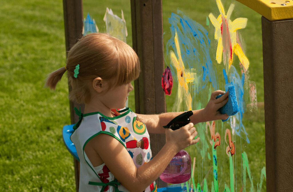Mounted on an easel or outside table, an artboard encourages children to play around with colored paints. If it’s placed on artificial grass, gravel or sand, any paint spills or stains can easily be cleaned up.