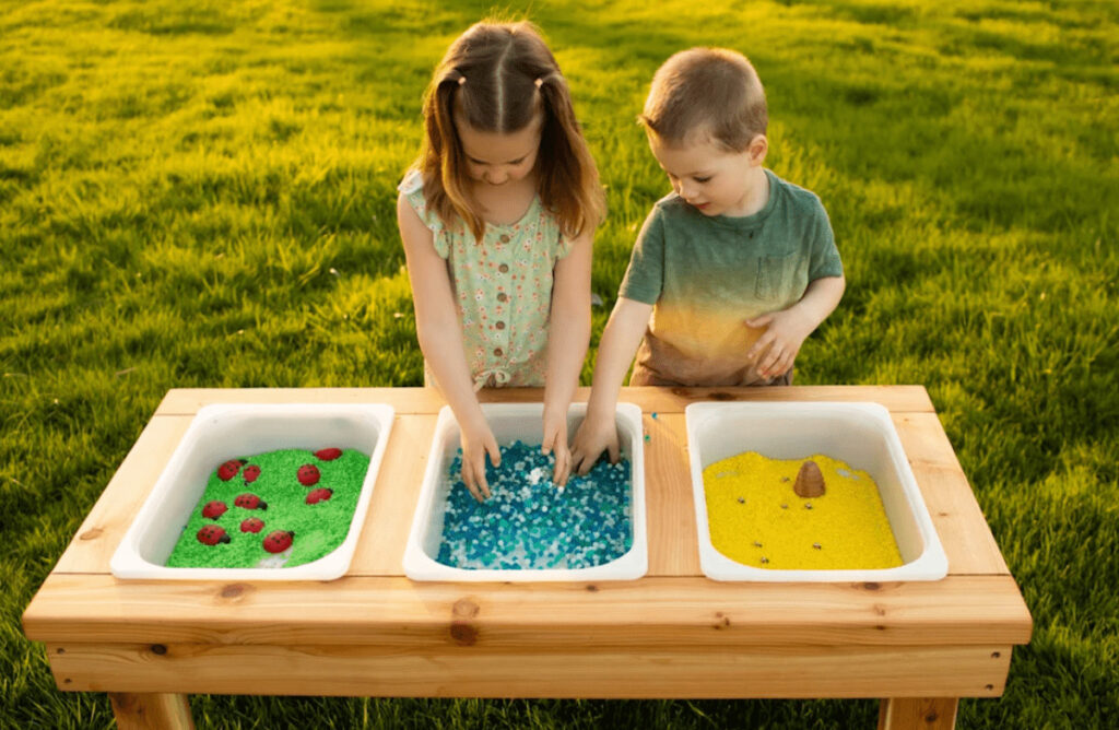 Another idea for stimulating the senses and promoting creativity in more confined backyard areas is a “sensory bin”.