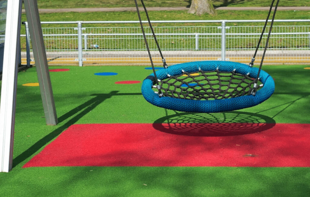 Not only should materials be non-abrasive, so that they don’t leave scrapes or scratches (like with asphalt) but they also need to absorb shock. Artificial grass for playgrounds must be installed on top of a layer of shock-absorbent padding that prevents fall injuries.