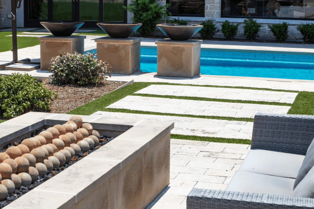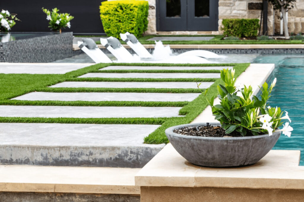 If you don’t want to replace your entire grass lawn with synthetic turf, you might consider running pavers from the house to the pool — with turf strips in between.