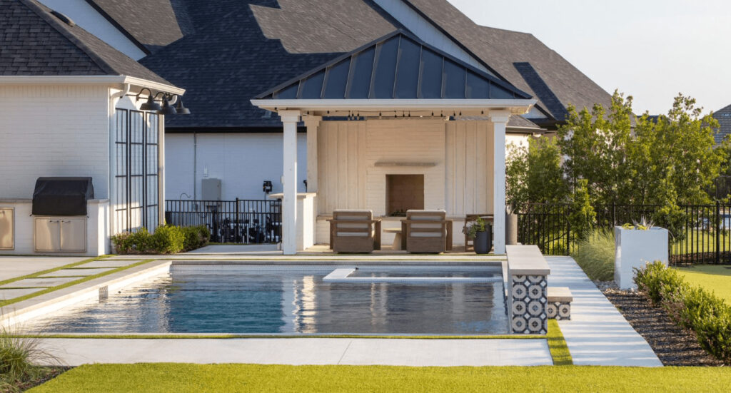 Artificial grass not only looks fantastic — as in the example above — but it also has some distinct advantages over real grass for pool areas in Dallas-Fort Worth homes.