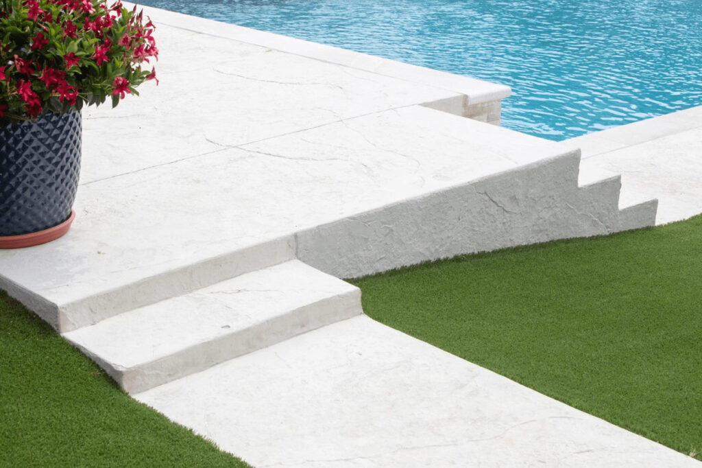 You’ll need to consider elements like blade length/shape, thickness, pile length, backing, color, drainage and more if you’re switching from real grass in your pool area.