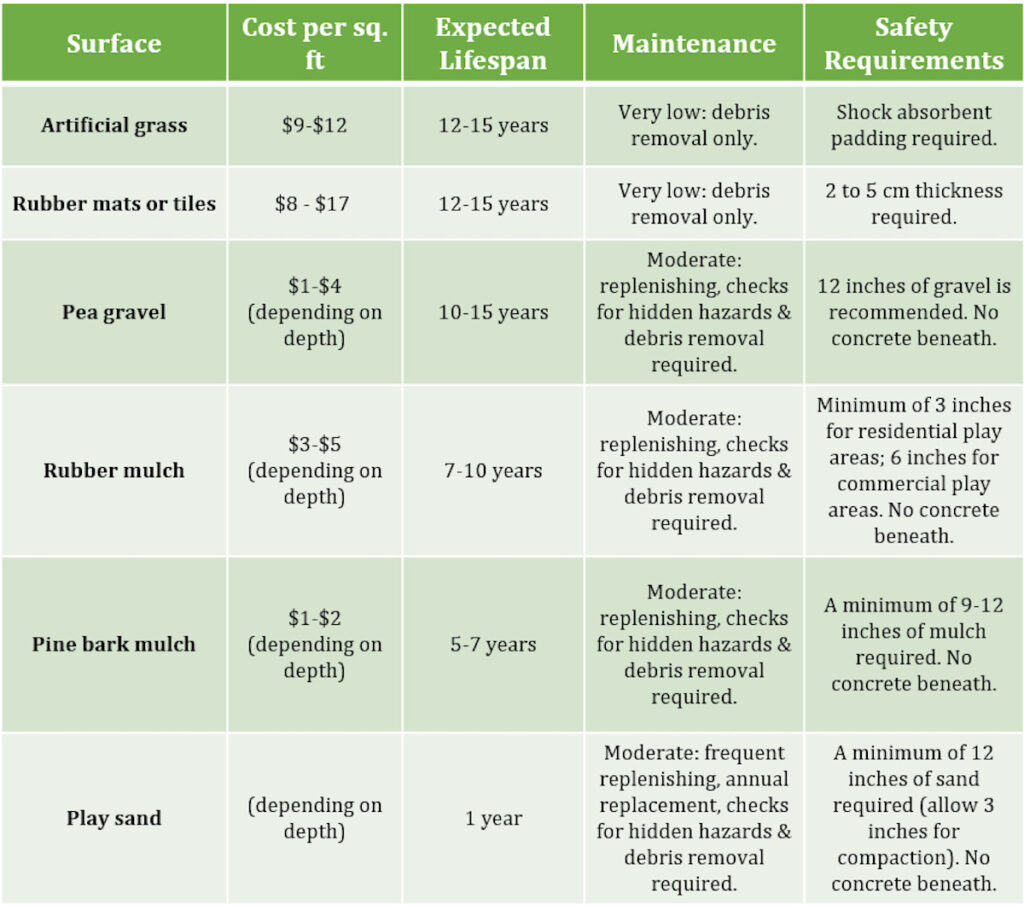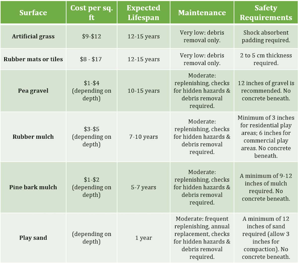 Let’s take a quick look at the six leading playground flooring materials and see how they stack up against each other for cost, lifespan, maintenance and safety requirements.