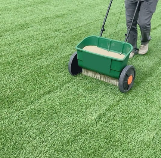 To change the infill, vacuum out all of the old infill and clean the area using an enzyme-based cleaner (described above). Then, add a good amount of the new antimicrobial infill—around two to three pounds of infill per square foot. This should be evenly spread using a plastic-pronged rake or equipment specially designed for the purpose.